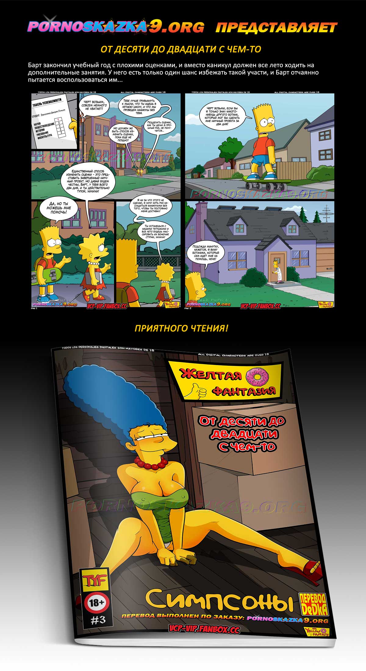 Порно комикс «От десяти до двадцати с чем-то. Симпсоны.» Барт закончил учебный год с плохими оценками, и вместо каникул должен все лето ходить на дополнительные занятия. У него есть только один шанс избежать такой участи, и Барт отчаянно пытается воспользоваться им…