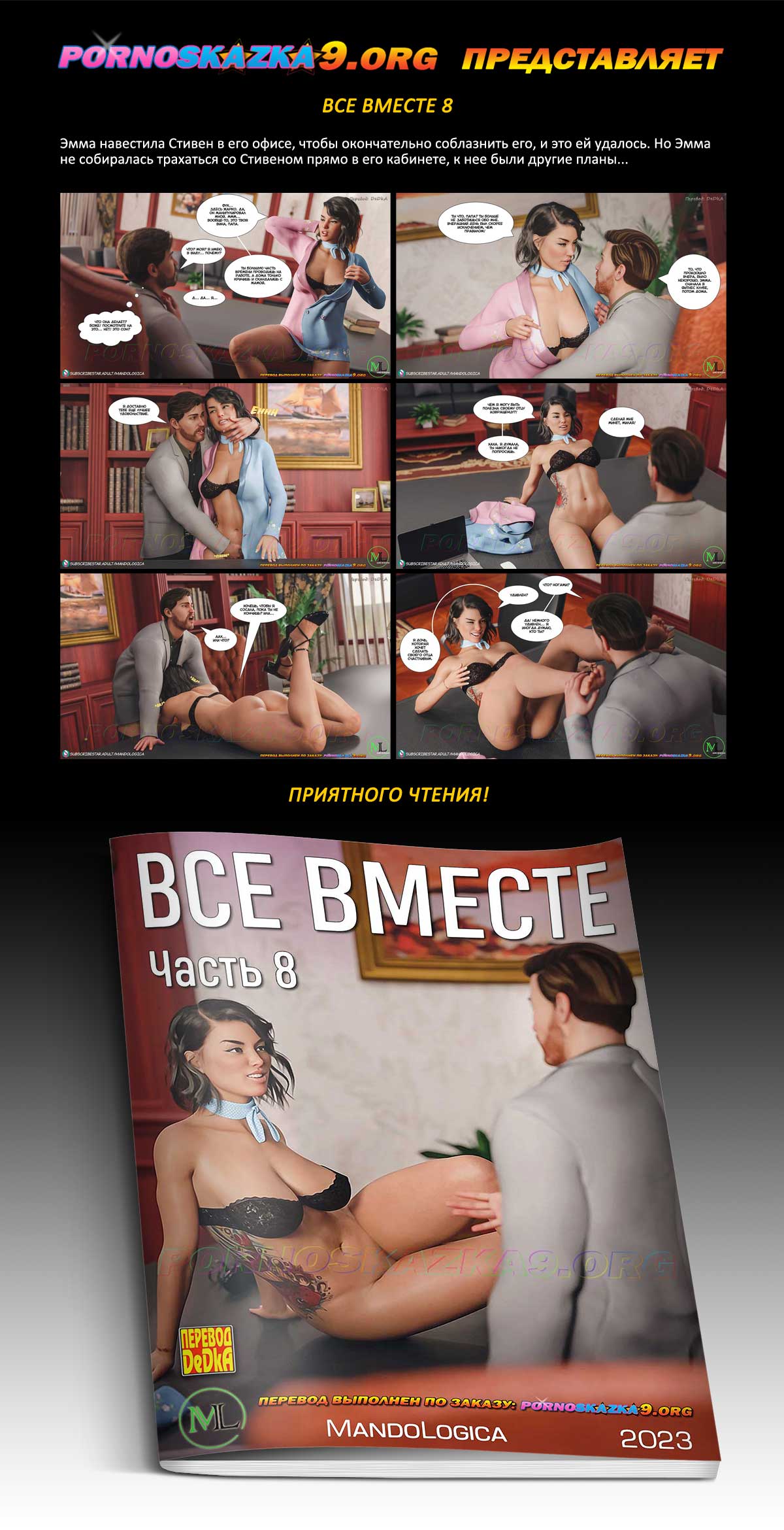 Порно комикс «Все вместе. Часть 8.» Эмма навестила Стивен в его офисе, чтобы окончательно соблазнить его, и это ей удалось. Но Эмма не собиралась трахаться со Стивеном прямо в его кабинете, к нее были другие планы…